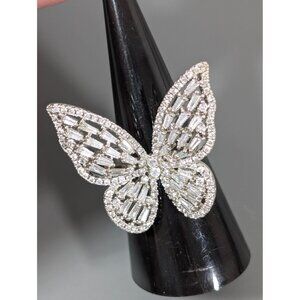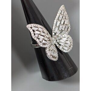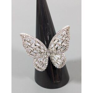 Silver Tone Baguette Rhinestone Butterfly Cocktail Ring Statement Size 7