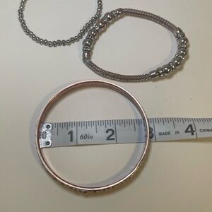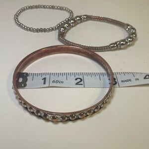 Elegant silver tone beaded bracelet set perfect for any occasion. One bangle bracelet, one stretchy beaded bracelet, and one “mesh” chain bracelet with beads. Good preowned condition.