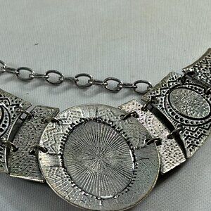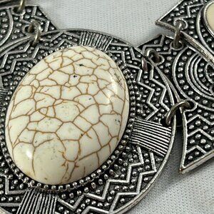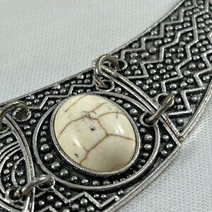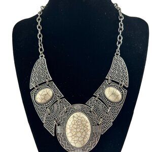 Silver Tone Bib Necklace Statement Ornate 19" Long Faux Marble Stones in good preowned condition.