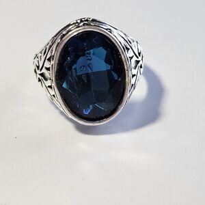 This is a silver tone ring with a blue oval faceted rhinestone. The ring is size 10.5 and is perfect for any occasion. The blue color of the rhinestone adds a touch of elegance to the ring, making it a great addition to any jewelry collection. The ring is made of high-quality materials and is sure to last for years to come.