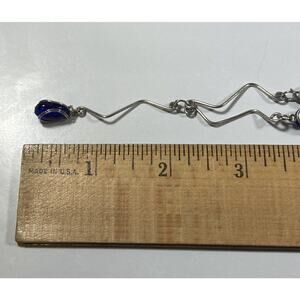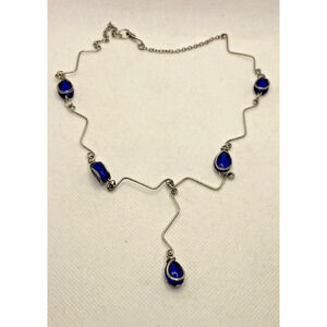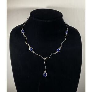 Silver Tone Blue Oval Glass Unique Link Station Necklace Drop Pendant 17 in