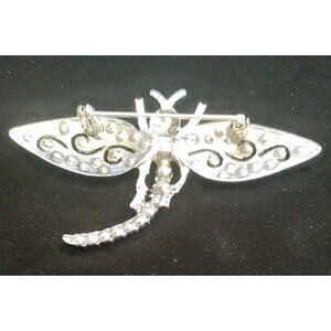 This Silver Tone & Blue Rhinestone Dragonfly Brooch is a stylish and elegant accessory for any outfit. Measuring 3" in length, the brooch features a dragonfly shape adorned with sparkling blue rhinestones, creating a beautiful contrast against the silver tone background.