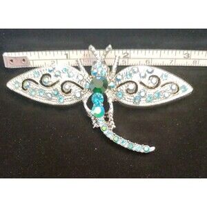 Silver Tone & Blue Rhinestone Dragonfly Brooch 3"X2"