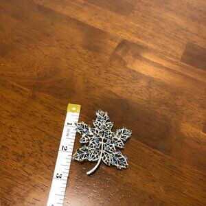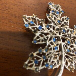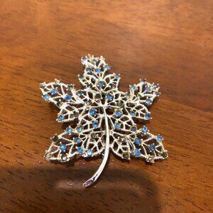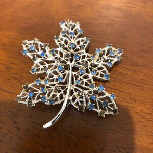 Silver Tone Blue Rhinestone Oversized Leaf Brooch Pin Pre-Owned.
