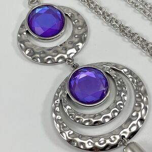 Silver Tone Boho Purple Glass Rhinestone Hammer Finish Pendant Tassel Necklace