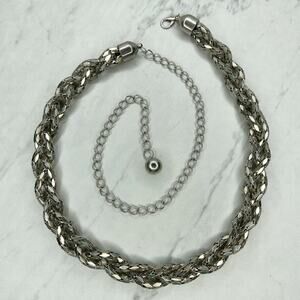 - Materials: Silver tone metal with braided chain construction