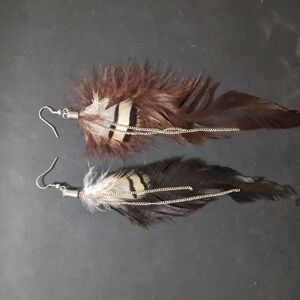 Silver Tone Brown Feather and Chain Long Dangle Statement Earrings