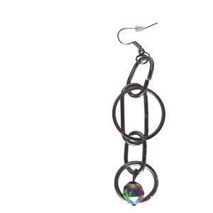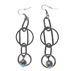 Long silver-tone chain-link drop earrings with iridescent geometric beads.
