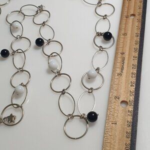 Silver Tone Chain Necklace Black White Beads Star Accents Circular Links Clasp