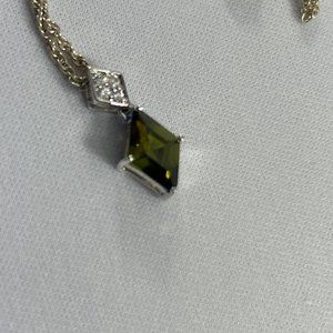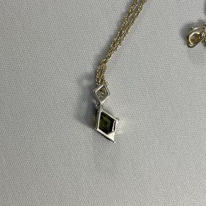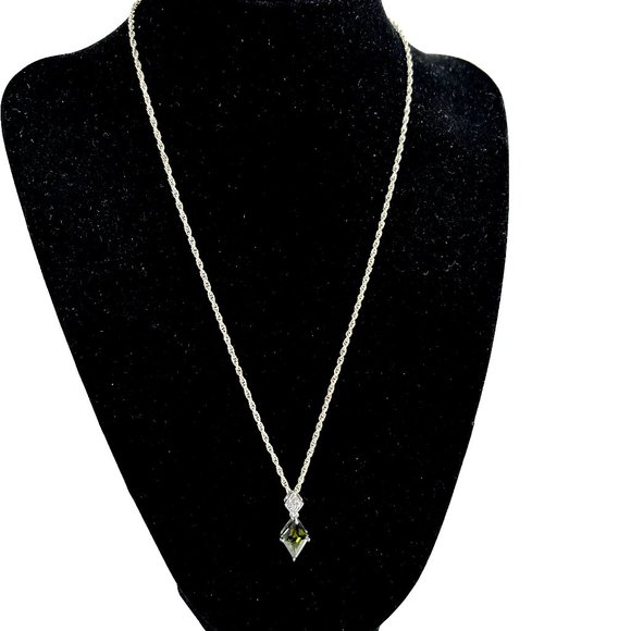 Silver Tone Chain Necklace Green Crystal Pendant Rhinestones 18"