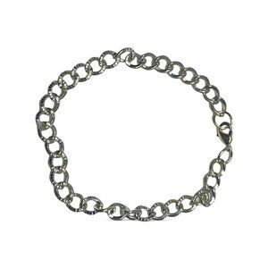 A simple, classic silver tone chainlink bracelet, ready for your own charms or worn without charms. Good preowned condition. Approximately 3" in diameter when closed, 9" in length when open. Lobster clasp closure. Not tested.