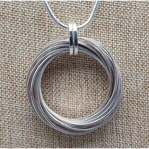 Stunning silver tone circular pendant necklace from Charter Club. Features a unique design on a long 30" snake chain, perfect for making a statement.