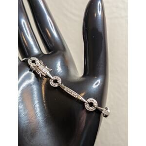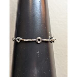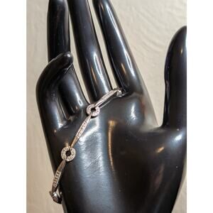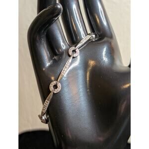 Silver Tone Circle Bar RL Tennis Bracelet. This fooled me. It is made to look like it has CZ's in it, but it is just made to look that way with lots of sparkle. Not sure what the metal is because I can't find a marking other than RL. Pre-owned, this bracelet is in excellent condition. Slide in clasp with two safety latches.