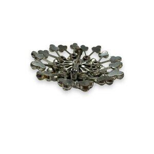 Add a touch of vintage glamour to your look with this stunning Silver Tone Clear Crystal Riveted Layered Snowflake/Star Burst Brooch. This brooch features a beautiful layered snowflake or star burst shape that is sure to catch the eye. The clear crystals add a touch of elegance and sophistication to any outfit. Measuring at 2" in length, this brooch is the perfect size to wear on a lapel or blouse. The brooch is in good vintage, pre-loved, ready-to-wear condition with no missing or chipped crystals and only minimal wear to the contact areas. There is some slight discoloration to a couple of the crystals, and photos make it appear much more prevalent than in person. Whether you're looking for a statement piece for a special occasion or an everyday accessory, this brooch is sure to impress.
