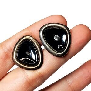 Silver Tone Clear Rhinestone Black Cufflinks .5" Vtg Unsigned