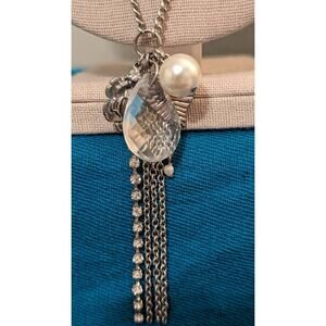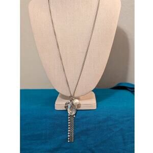 Silver Tone Cluster 22-24.5" Necklace With Rose, Rhinestones, Pearls, etc.. Pre-owned, this necklace is in excellent condition.