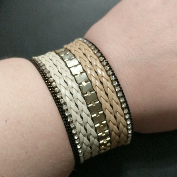 Silver Tone Cream Tan Leather Clear Rhinestone Magnetic Clasp Cuff Bracelet