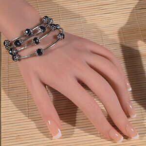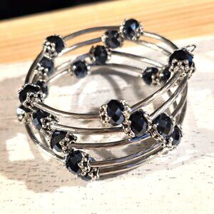 Silver Tone Crystal Wrap Bracelet With Black Faceted Beads & Filigree Details