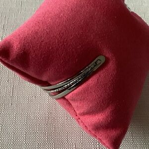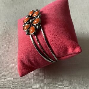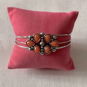 This oval cuff has pretty acrylic rust colored stones in a teardrop shape, with solid silver tone beads accents. The band is silver tone the middle band has an intricate design.