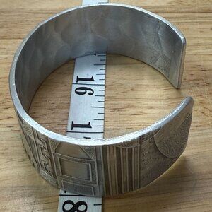 Possible WAF (Wendell August Forge) hand-hammered pewter cuff bracelet with an Art Deco/Southwestern design. Or similar style Per google ai.