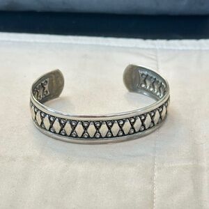 Silver tone cuff bracelet w/diamond shape & dot design. No marks, stamps or signatures. Unknown metal. 16mm wide. Adjustable size. EUC.