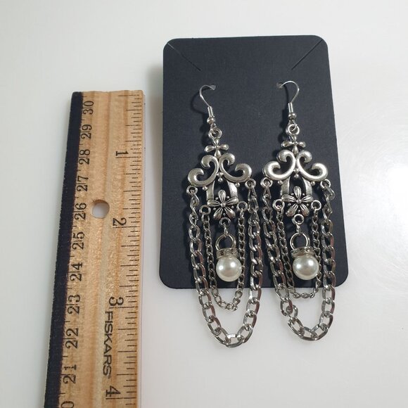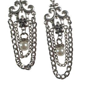 Silver Tone Dangle Earrings Ornate Design Chains Faux Pearl Accents Hook Back