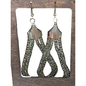 These silver-tone dangle earrings capture the essence of elegance with their delicate dangling chain loops. Perfect for adding a touch of sophistication to any outfit, they feature a lightweight design that ensures comfort throughout the day. The hook closure makes them easy to wear, whether you're heading to a casual brunch or an evening gala. Their versatile style makes them a must-have accessory for any occasion. Preowned in excellent condition.