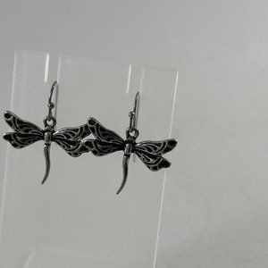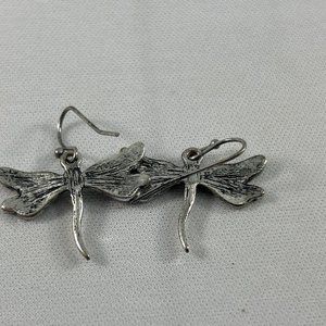 Silver Tone Dragon Fly Dangle Earrings Textured Nature Hooks 1" in good condition.