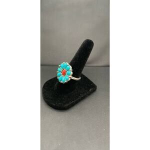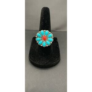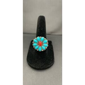 Silver Tone & Faux Blue Turquoise Red Faux Center Stone Boho Southwestern Ring 6