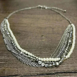 Silver Tone Faux Pearls and Crystal Beads 7 Strand Necklace