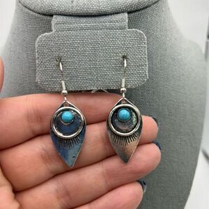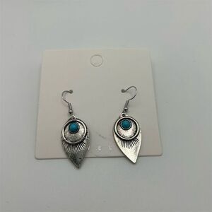 Keywords: dangle earrings, drop earrings, silver earrings, faux turquoise earrings, vintage style jewelry, bohemian style, teardrop shape, silver tone metal, faux turquoise stone, hook closure, everyday wear, new with tags, NWT earrings, boho chic.
