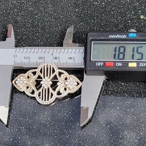 Silver tone filigree brooch pin featuring an intricate floral and decorative design. Measures approximately 1.81 inches in length. Perfect for adding a touch of elegance to any outfit or for collectors of vintage jewelry. Packaged and shipped carefully from a smoke-free environment. Check my Feedback and other listings.