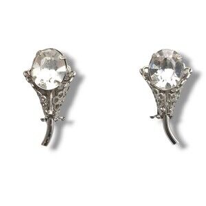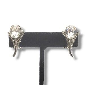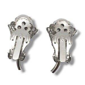 Silver Tone Filigree Oval Faceted Prong Set Rhinestone Clip On Earrings Floral