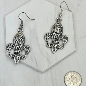 Silver Tone Fleur de Lis Scroll Dangle Earrings