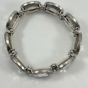 This is a silver tone bracelet made of glass rhinestones in a bohemian style. The bracelet is stretchy and has a chunky, fun, and funky design. It is suitable for various occasions such as engagement, graduation, wedding, birthday, and anniversary. The bracelet is not signed and is not personalized.
