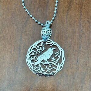 Stunning gothic raven pendant necklace, featuring a 1.37-inch diameter pendant on a 24-inch stainless steel ball chain. The intricate design showcases a raven perched among delicate branches, perfect for adding a touch of mystique to any outfit. Also available in black pendant with a black chain - check out my other listings for the all black option.