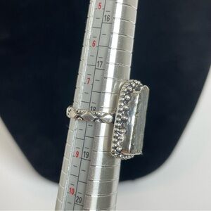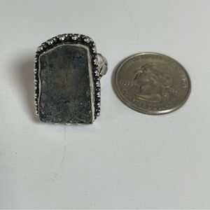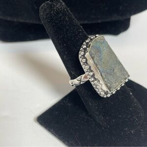 Gorgeous Labrodite stone ring on an intricate silver tone band. Size 8. Laborite is believed to enhance intuition, promote transformation, and protect against negative energy. Good preowned condition.