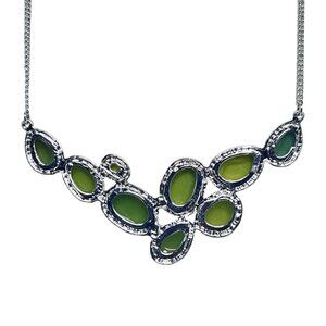 This timeless silver-tone bib necklace and earring set evokes a vintage charm. The green accents add a pop of elegance, perfect for a classic look.
