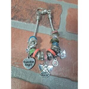 Silver Tone Guardian Angel Dangle Charm Bracelet Slide Beads Retro 7.75"