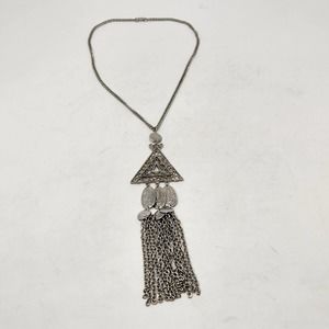Silver Tone Layered Pendant Tassel Chain Necklace Statement Triangle Textured