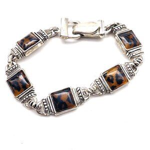 Stylish vintage-inspired bracelet featuring rectangular leopard print panels framed in detailed silver-tone links. A bold accessory that adds flair to any outfit.
