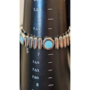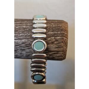 Silver Tone Long Bead Stretch Round Turquoise Enamel Bead Bracelet. Pre-owned, this bracelet is in excellent condition.