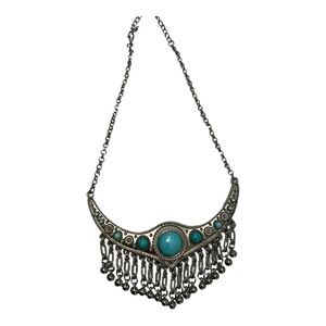 Silver Tone Metal Fringe turquoise Stone Collar Necklace $9