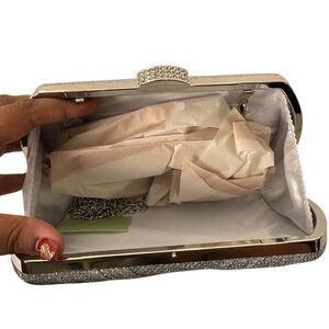 This is a stylish Silver Tone Metal Hardware Frame Clutch Evening Bag with a glamorous Glitter Fabric exterior. It features a Gray lining with Silver hardware accents. The bag has a sleek metallic finish and a theme of Metal, making it perfect for evening events or special occasions.