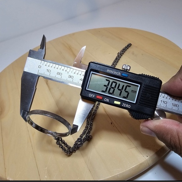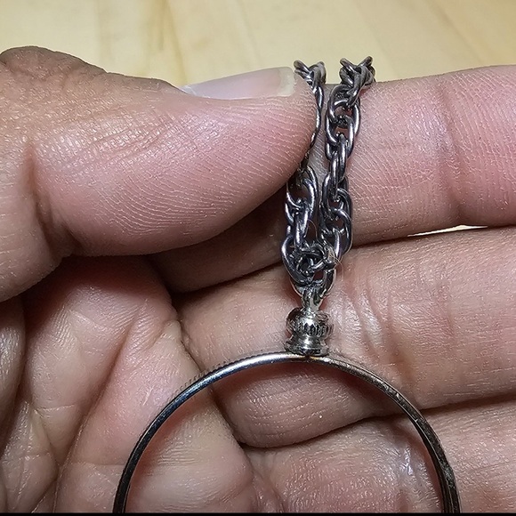 Silver Tone Metalic Coin Bezel And 24 Inch Silver Tone Metalic Chain Necklace appears to hokd a 37mm coin ive added pictures of the outer and inner measurement excluding the lip that hokds the coin sold as is see pictures for reference