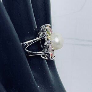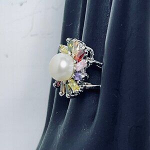 Silver Tone Multi-Colored Rhinestones & Faux Pearl Statement Ring Size 5 (R430)