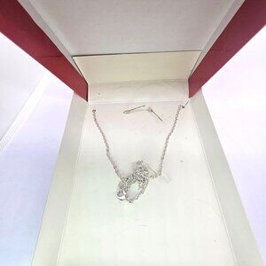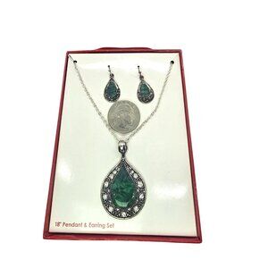This elegant jewelry set includes an 18-inch necklace and matching earrings, designed with a silver tone finish. The faux mother of pearl enamel adds a touch of sophistication, making it suitable for various settings, from formal events to professional occasions. The set is presented in a gift-ready box.