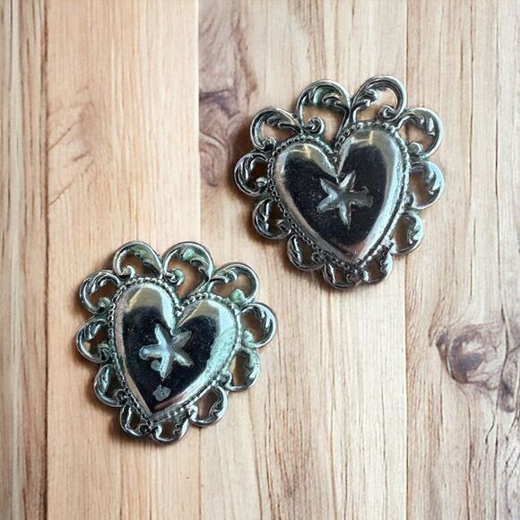Silver tone lightweight heart framed stud earrings, the size is a bit smaller than a quarter, good vintage condition