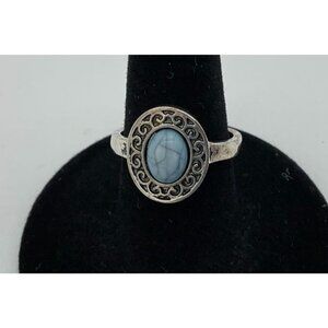 Silver Tone Oval Blue Veined Stone Solitaire Filigree Frame Ring 6.5