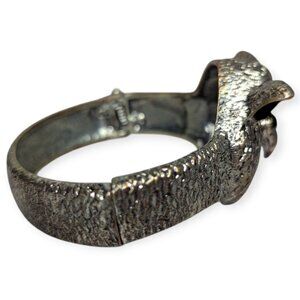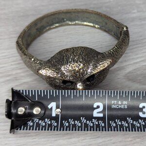 Unique silver owl cuff bracelet with black eyes. Perfect for adding a whimsical touch to any outfit.
